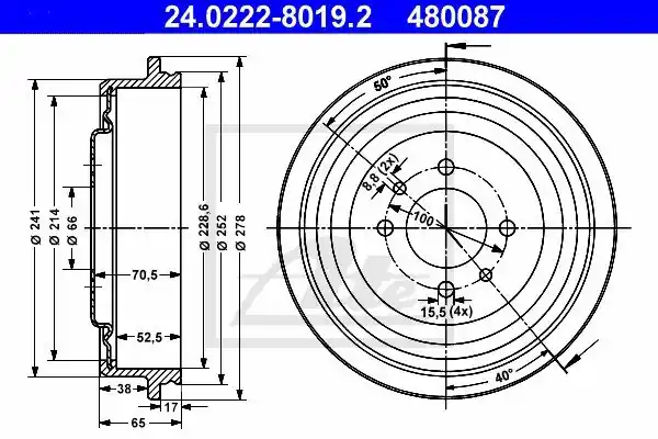 (229X52,5MM)KANGOO EXPRESS/RAPID KASTEN (FC_) (98-) KANGOO GRORAUMLIMOUSINE (KC_) (98-) LAGUNA I GRANDTOUR (K56_) (95-00) MEGANE I GRANDTOUR (KA_) (98-03) Bęben hamulcowy ATE 24.0222-8019.2 24.0222-8019/ATE ATE